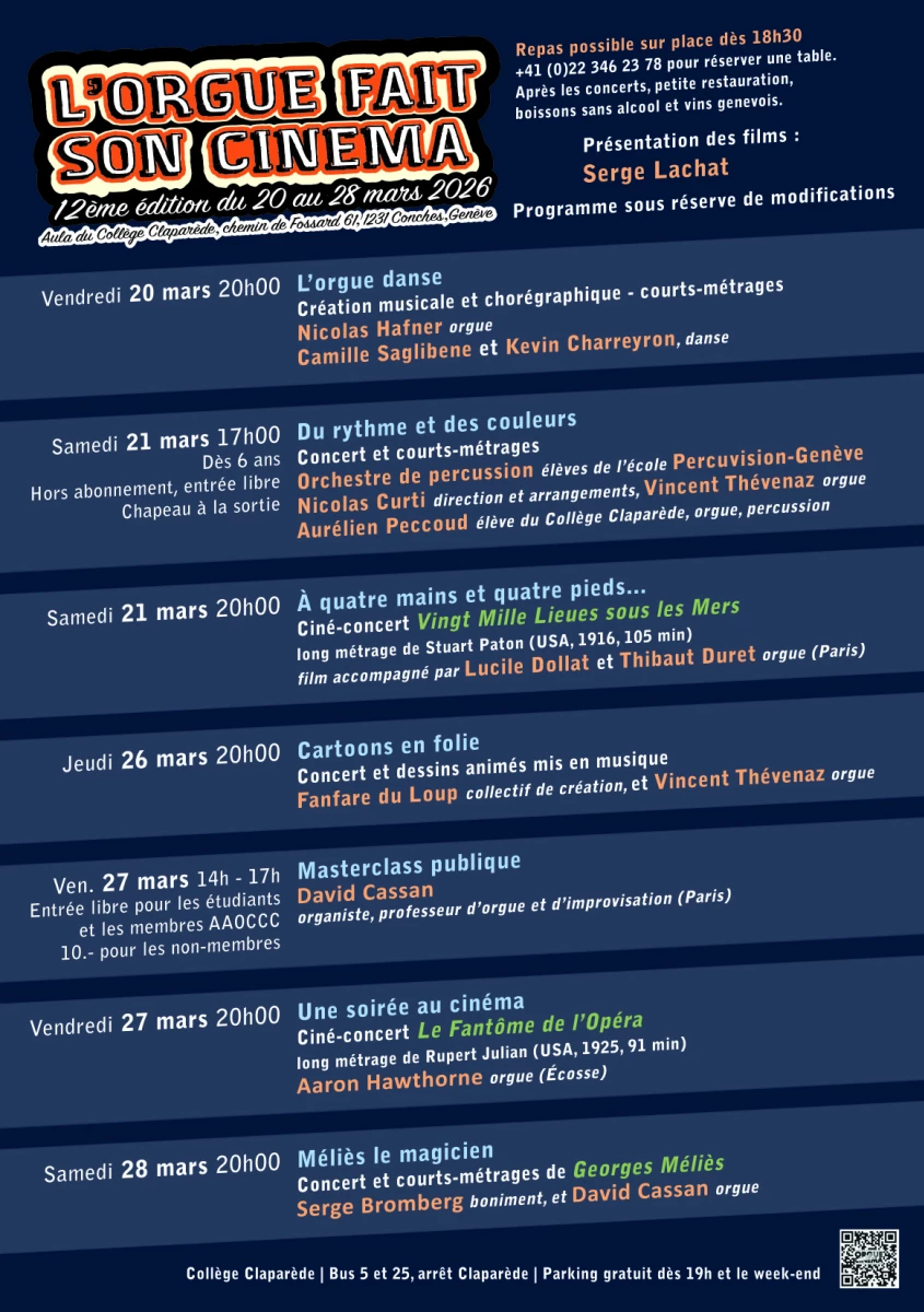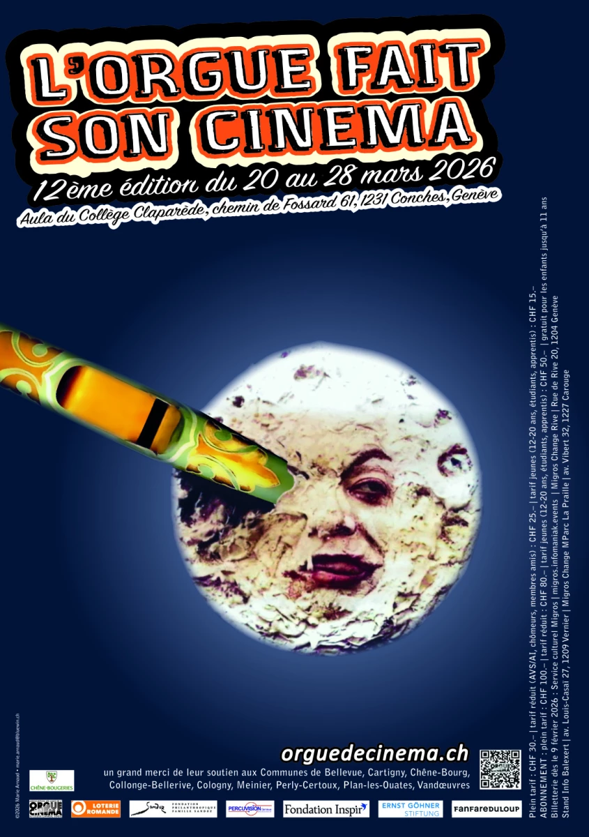 Du 20 au 28 mars 2026 se tient le 12e festival "L'orgue fait son cinéma" au Collège Claparède, un événement qui prendra une couleur toute particulière : immédiatement après le tomber de rideau, l'orgue Wurlitzer de 1937 sera démonté pour une restauration en profondeur. Le prochain festival attendra jusqu'en novembre 2027. Ne manquez donc pas cette occasion unique et partagez avec nous ces moments d'émotion!